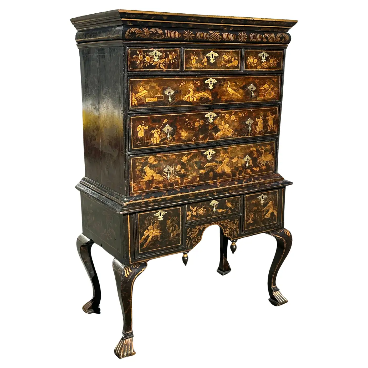 Fine English George I or Queen Anne Black Lacquered Chinoiserie Chest on Stand. Original Chinoise Design with figures, exotic birds, temples and architecture. Great patina and retention of its primary faux tortoise shell paint. Multiple drawers including original ogre drawer hidden in top frieze. Period appropriate hand-made pulls and escutcheons. Original Chinoise design on sides as well.