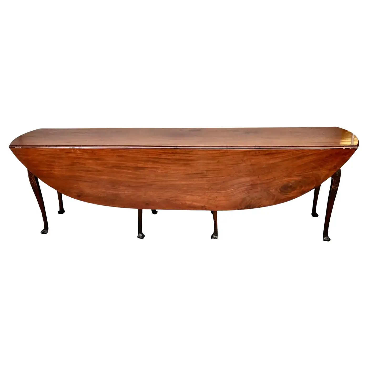 Irish Georgian Large Wake Table. Dining Table. Great Mahogany board top. Legs with carved knees and Spanish feet. Legs and apron retaining “peat” coloring while top has mellow rich patina from decades of use. 91″ long 29″ high 18 3/4″ deep when closed 54 3/4″ deep when drop leaves are open