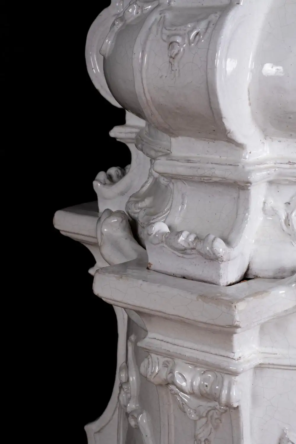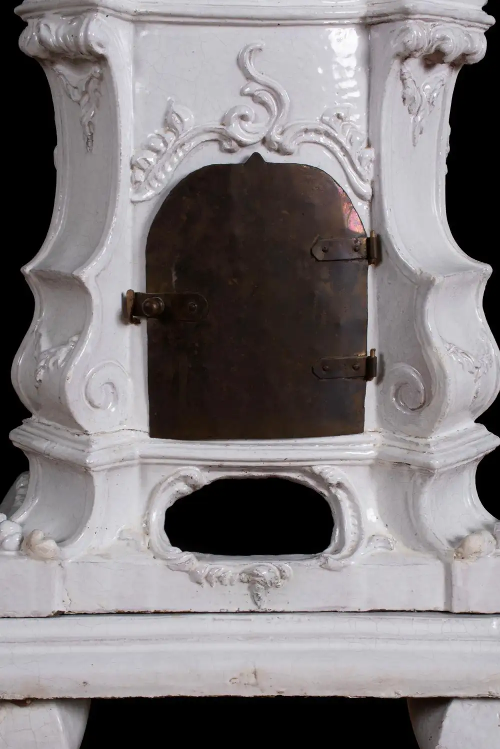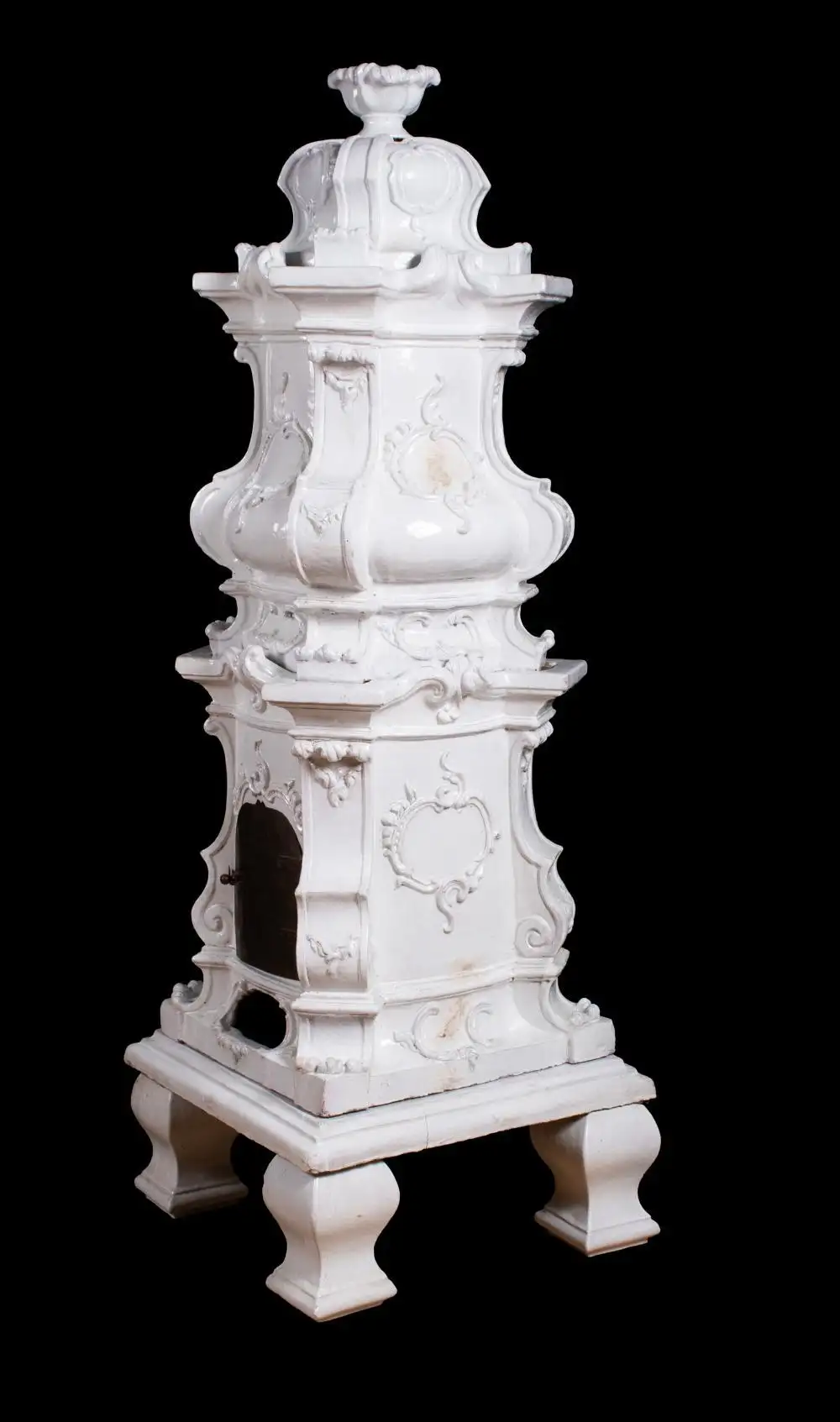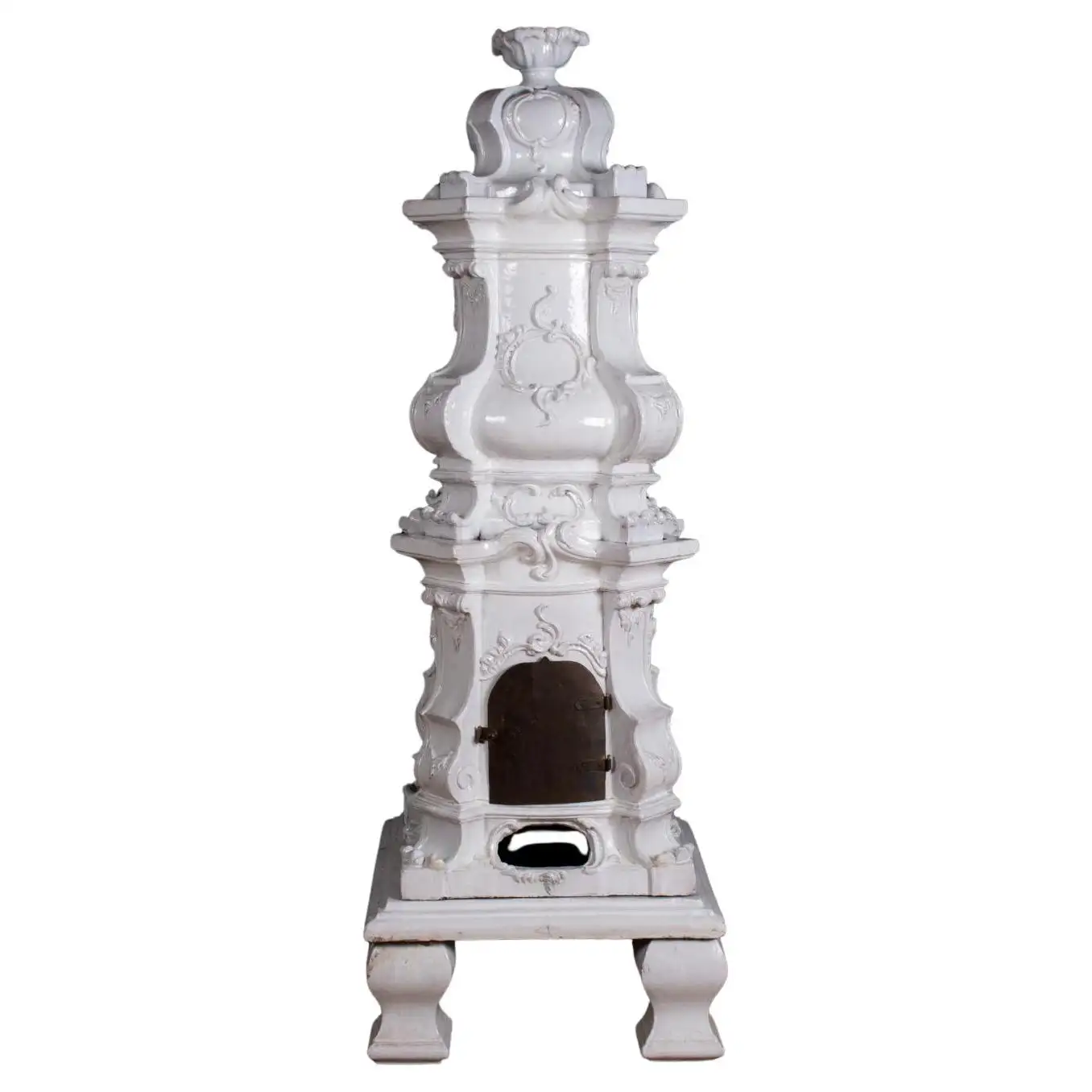 Austrian White Terracotta Tile Stove or Kachelofen. Mid 19th Century in Rococo Style. Multiple parts with iron loading door and vent. In good condition, only minor chips. In nine sections.