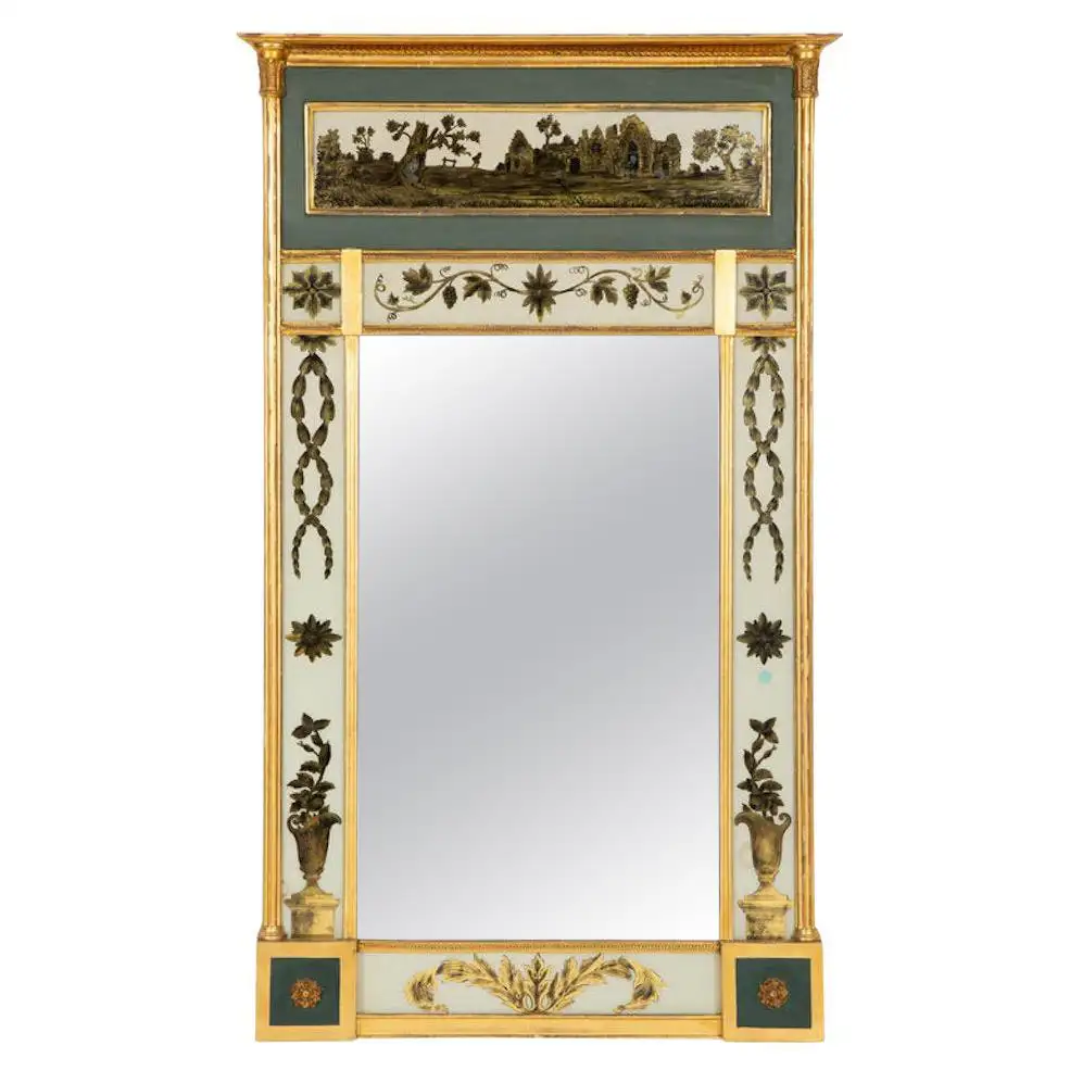 19th Century Giltwood Mirror. Handpainted and Gilt Eglomise Panel all surrounding the mirror plate. Landscape in upper panel, Neoclassical urns in side. Just lovey. A great survivor Ex. Collection, Palm Beach