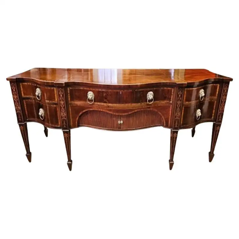 Early 19th Century Mahogany Sideboard. Late Regency to Early William IV Period. Beautiful neoclassical inlays of bellflowers and framed banding in satinwood and tulipwood. Original Lion Head Pulls. Right hand deep drawer for wine and staked drawers on left. Central frieze drawer with later felt lined silver drawer. Tambour storage in middle. Wonderful color and patina showing history. Not skinned. Finish cleaned and refreshed.