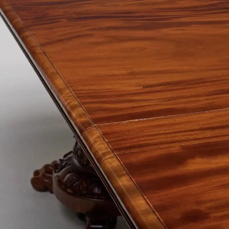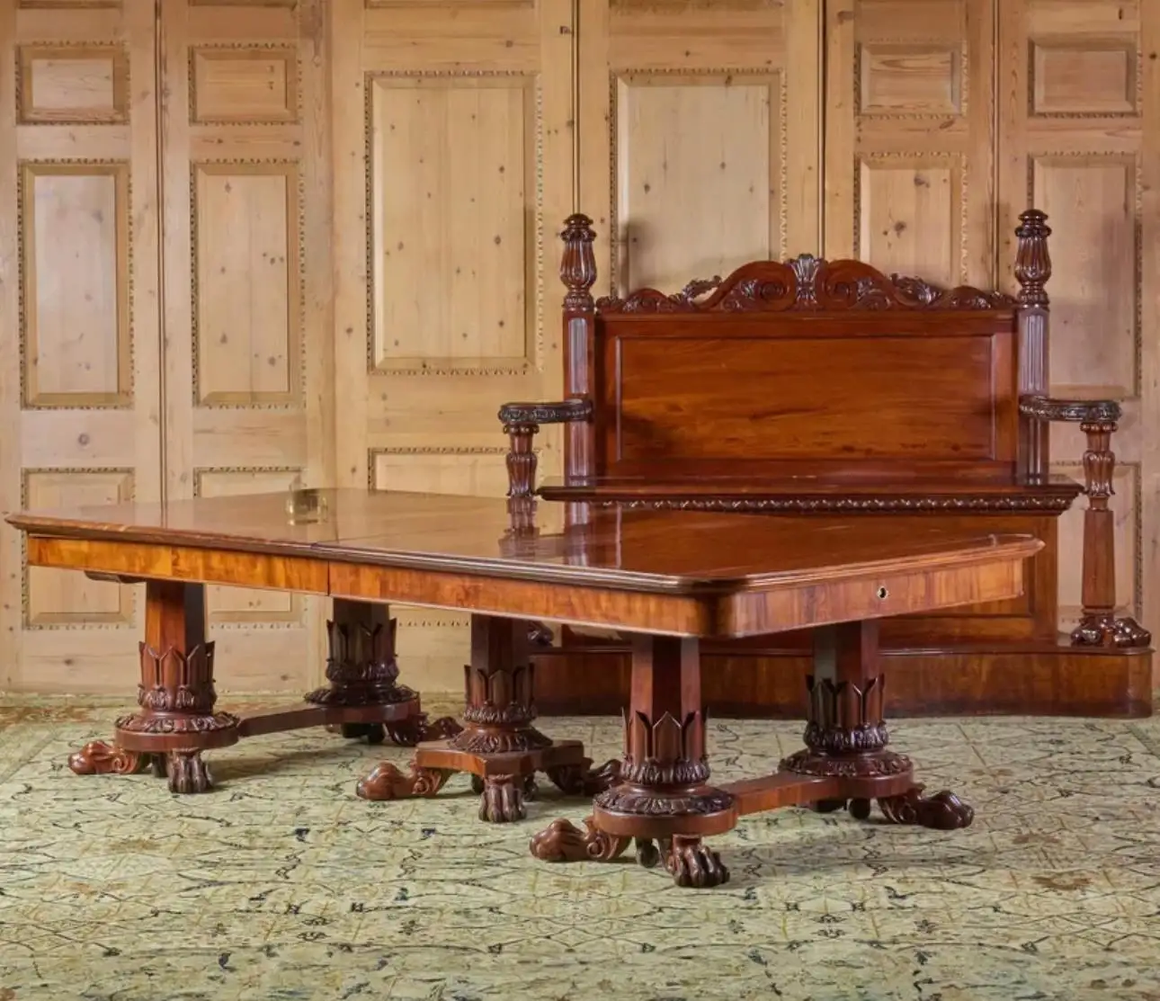 Fine William IV Mahogany Extension Dining Table and an Ensuite Carved Mahogany Hall Bench The hall bench holding three leaves and three pads. The hall bench, 5 ft. 5 in. x 7 ft. 3 1/2 in. x 25 1/2 in. Table 30 x 13 ft. 9 in. x 4 ft. 6 in. (with two leaves). The table can accommodate two additional leaves which would add another 4 ft. 3 in. in length. Provenance: Didier Aaron, New York, July 2, 1991.
