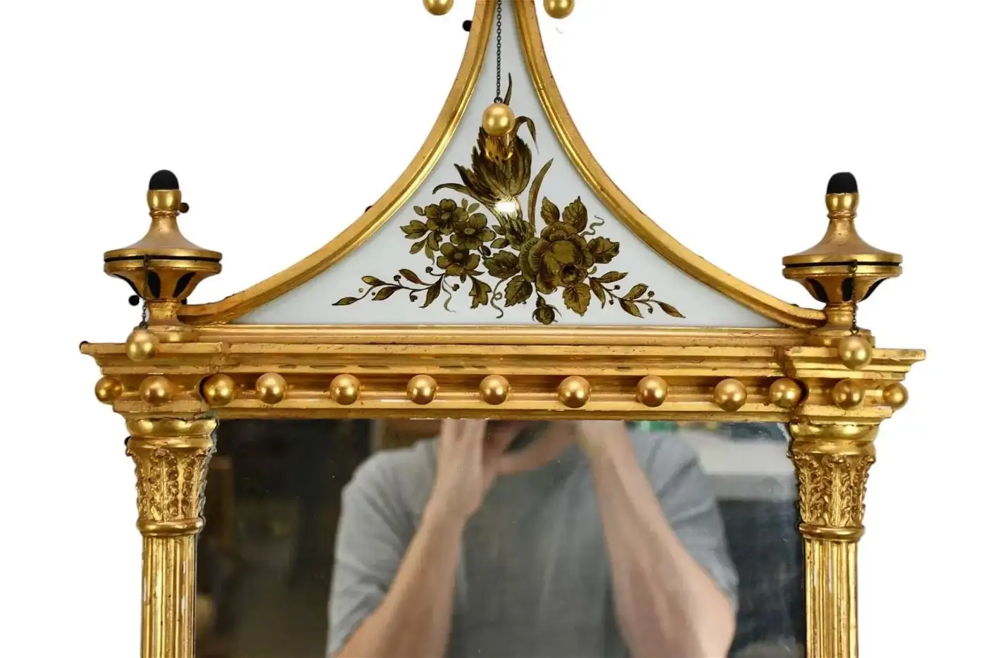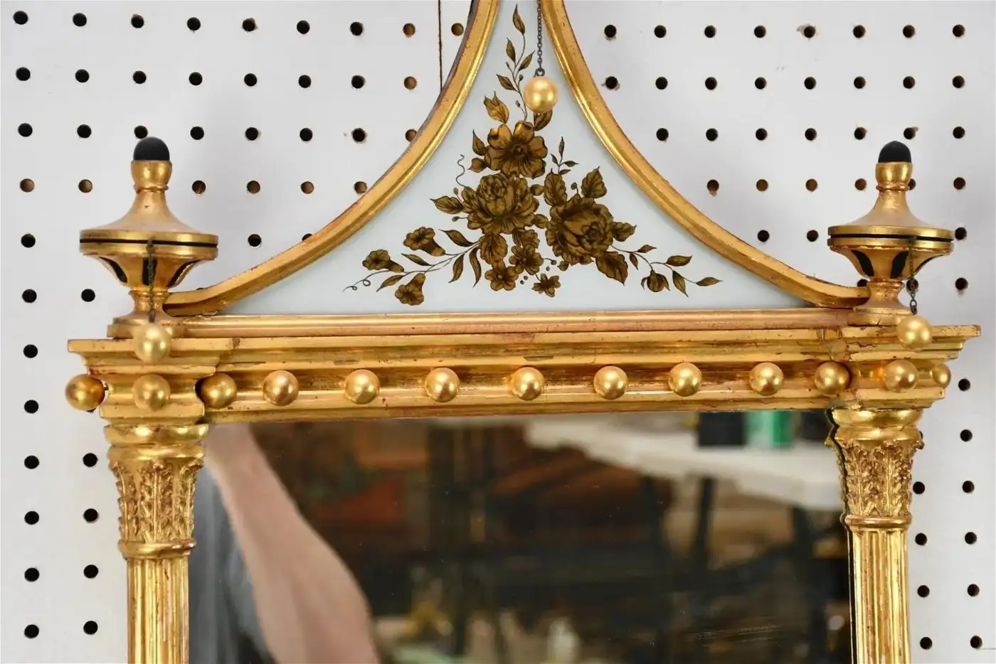 Pair of American Federal Hepplewhite Mirrors with Pineapple Finials. Wonderful pediment shaped eglomise panels with floral gilt. Gilded balls and columns. A true pair. Possibly Albany, New York Provenance: Purchased at The Winter Antique Show, New York